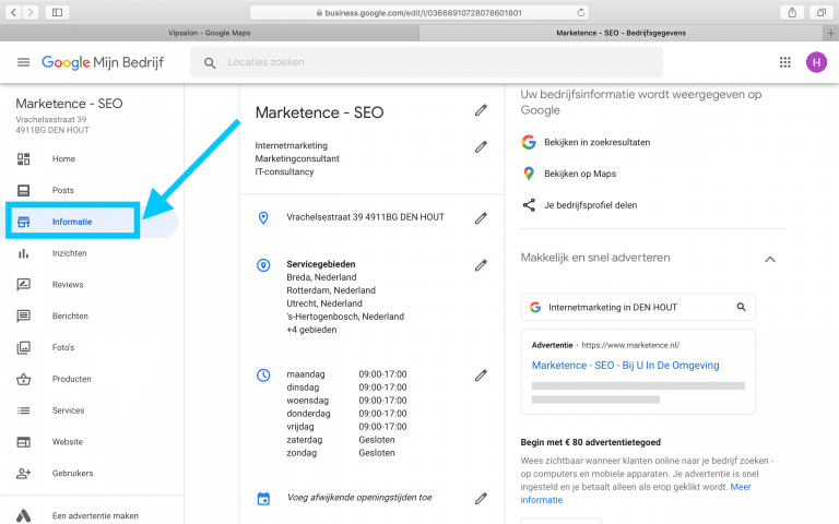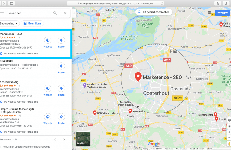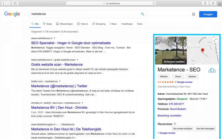 Zo laat hij links mijn bedrijfsnaam zien met openingstijden en met een beetje geluk ook het zoekwoord. Rechts is een mooi overzicht van de plaats en lokatie waar ik te vinden ben.