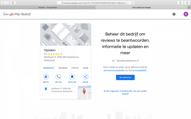 Het kan zijn dat jouw bedrijf al bekend is. Dit kun je eenvoudige controleren door te zoeken op je eigen bedrijfsnaam. Zie je vervolgens een resultaat met daaronder een link “Dit bedrijf claimen” of “Eigenaar van dit bedrijf?”, dan is dus wel je bedrijf bekend, maar nog niet in beheer. Nu is het zaak om te zorgen dat jij het beheer kunt gaan doen over deze vermelding. Klik op “Dit bedrijf claimen”.