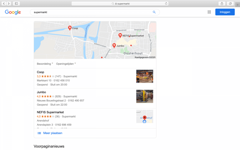 Naast de resultaten in Maps, herken je onderstaand screenshot waarschijnlijk vooral van de zoekresulaten op je telefoon. Zelf ben ik hier groot fan van. Je bent aan het rondrijden en zoekt even een supermarkt. Het enige zoekwoord wat je intikt is “supermarkt” en Google laat de resultaten zien in een straal van ongeveer 1km om je heen.