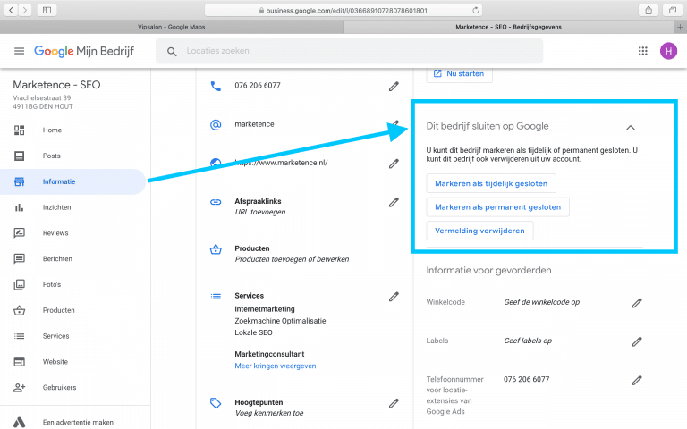 Let op: hiermee sluit je dus niet je bedrijf! Wat je eigenlijk doet is de vermelding verwijderen uit jouw Google Mijn Bedrijf zodat je deze niet meer kunt beheren. Maar de vermelding blijft gewoon nog steeds actief bij Google. Dit is wel een goede optie als je je bedrijf verkocht hebt, of als je de vermelding eenvoudig niet meer wilt of kunt beheren. Let er wel op dat je dan eerst een nieuwe beheerder toegang geeft.